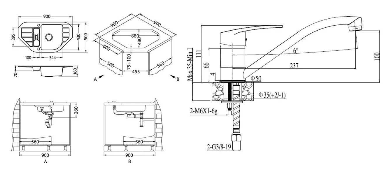 - dimensions de l’évier : 344 x 430 x 160 mm