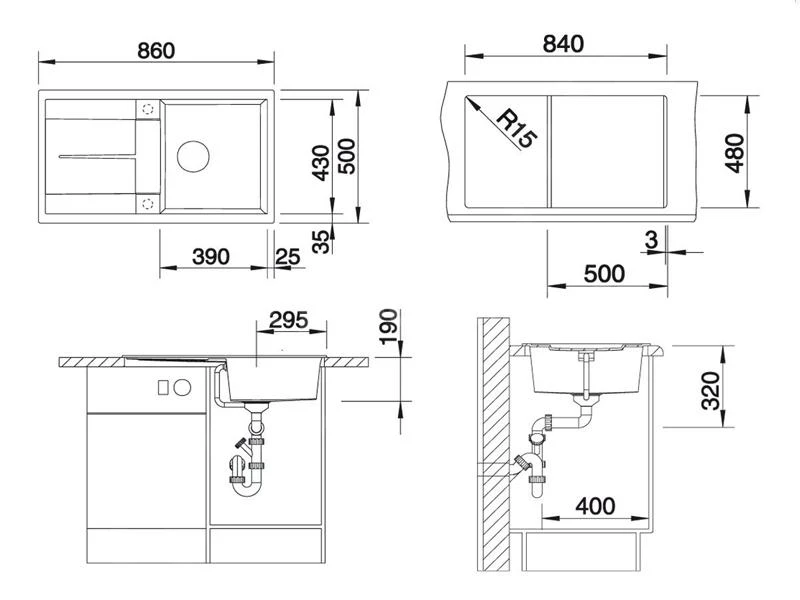 - dimensions de l’évier 390 × 430 mm