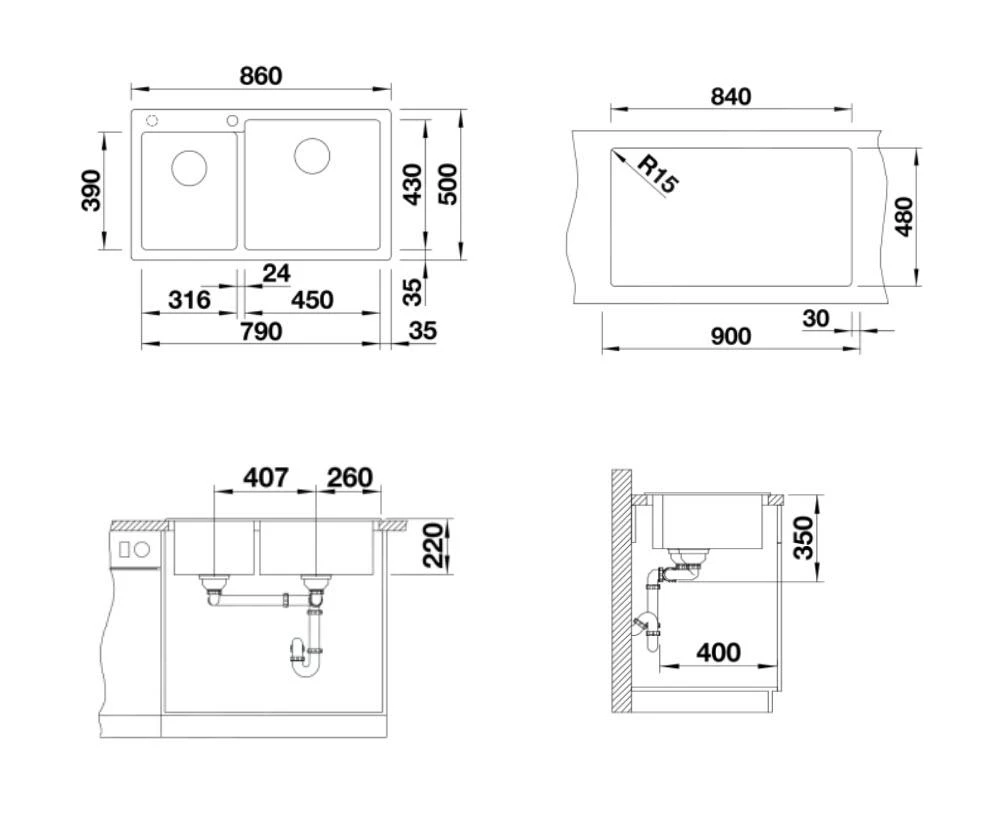 - dimensions totales de l’évier : 860 × 500 mm