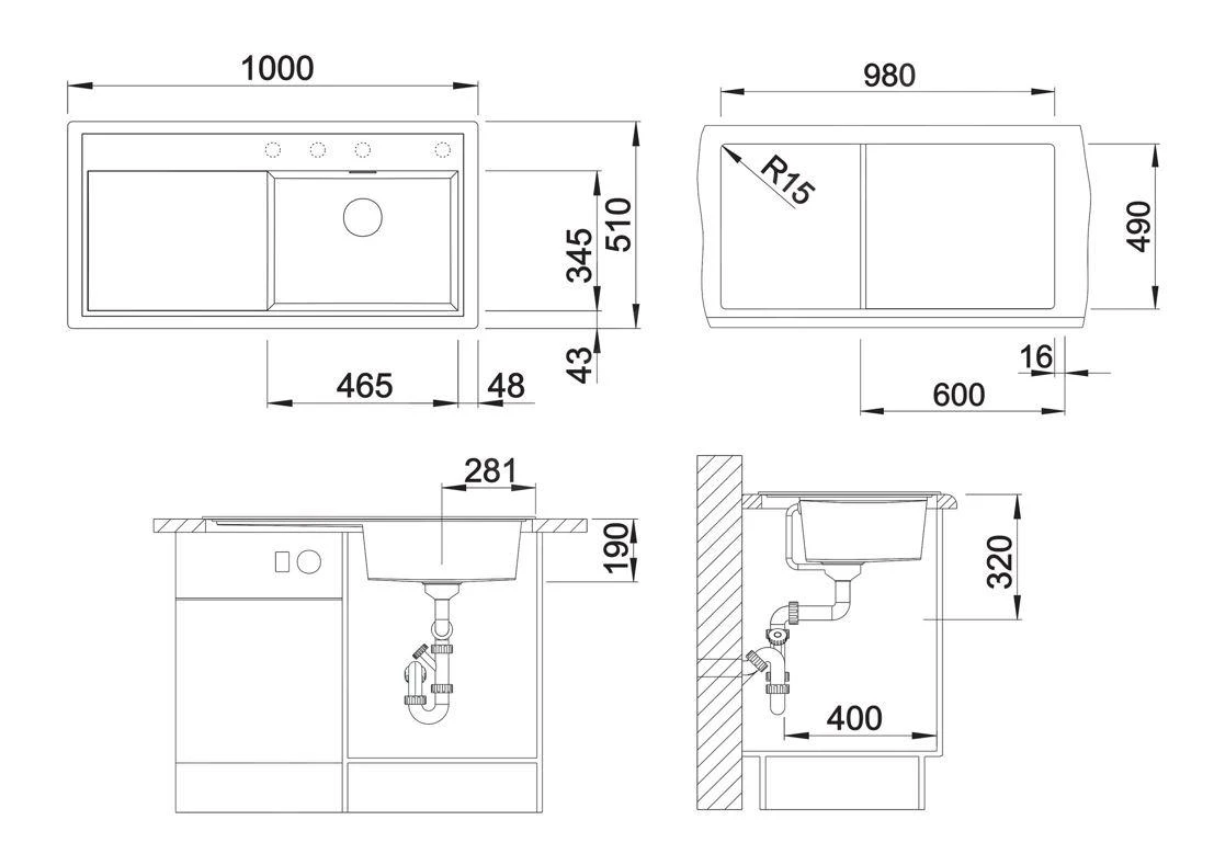 - profondeur de l’évier 190 mm